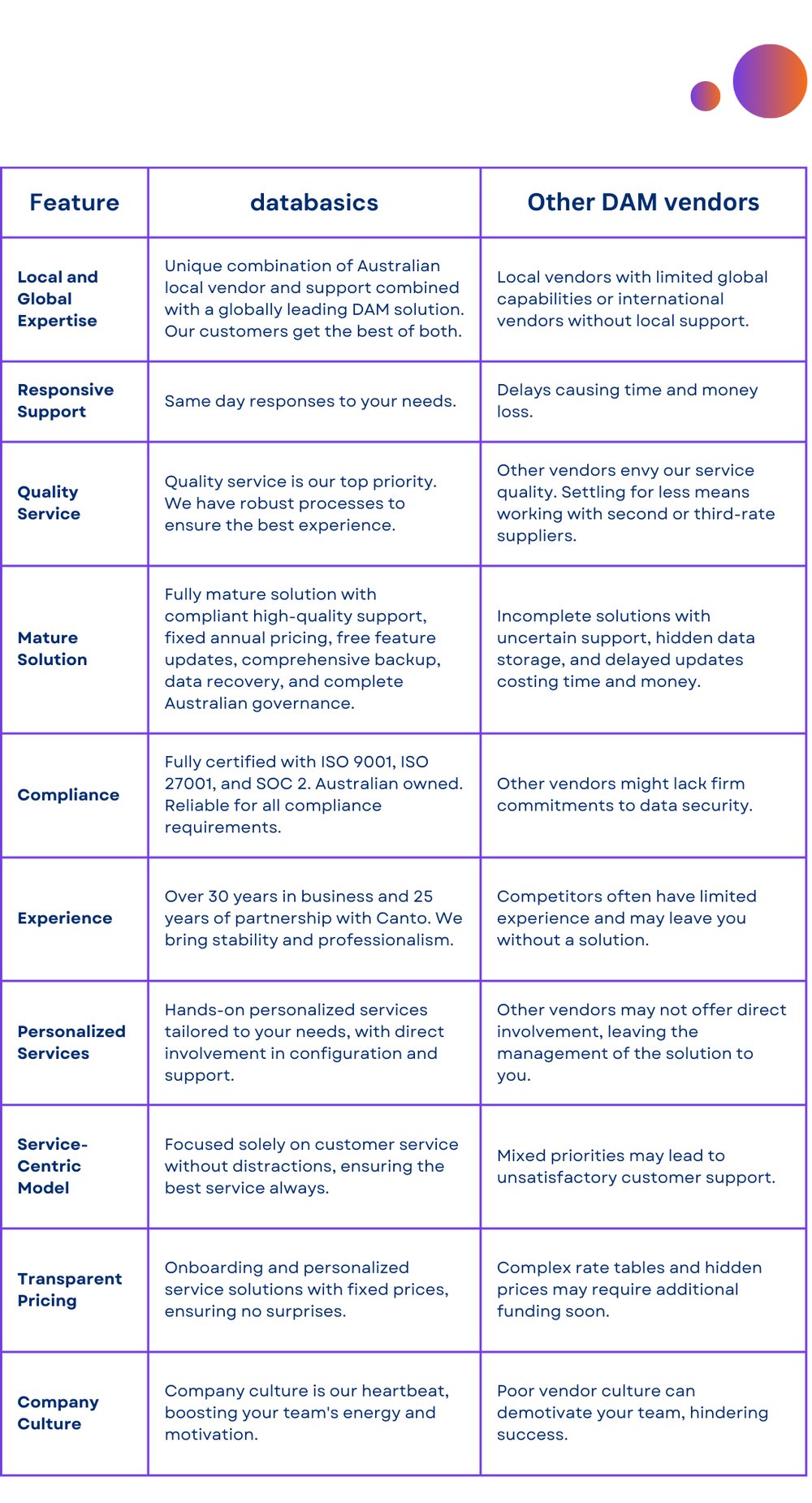 Unique combination of Australian local vendor and support combined with a globally leading DAM solution. Our customers get the best of both.