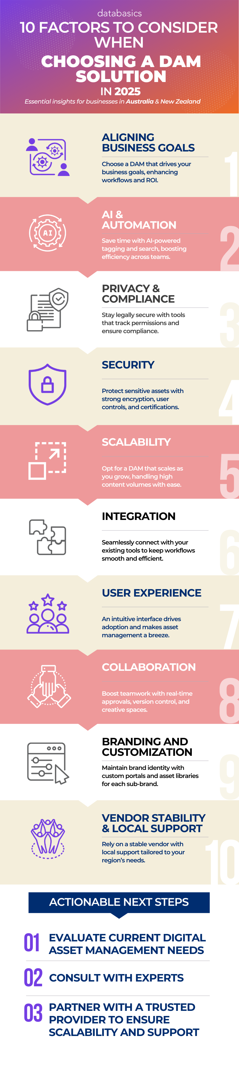 Choosing the right Digital Asset Management (DAM) solution in 2025 is critical for businesses striving to stay agile and efficient. Back in 2020 we wrote a popular blog post on factors to consider when selecting a DAM vendor in Australia. As digital content demands continue to evolve, so do the considerations. It’s essential to pick a DAM that not only meets today’s needs but also scales with future growth. Our latest infographic simplifies this decision-making process by breaking down the 10 key factors to consider when choosing a DAM solution in 2025 (and beyond).