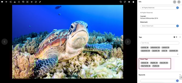 Smart Tags will not be able to provide tags relevant to your business, for such tags the metadata will need to be applied manually. Take a look at the two examples below. First, a generic image of a sea turtle in its environment successfully tagged with Smart Tags. The second image is of a particular meeting at your office tagged with generic Smart Tags. Note no specific tags of this meeting were applied, as they are not known to the AI tool.