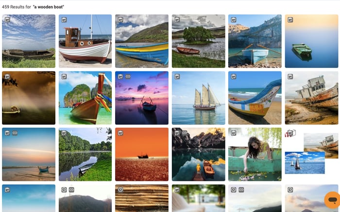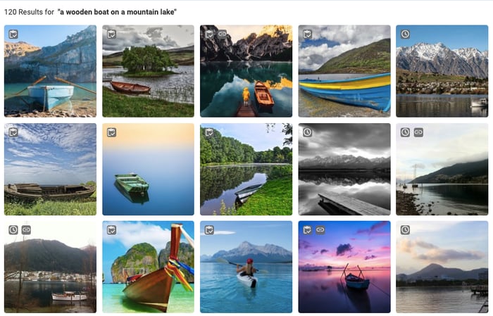 Now, you need something more specific—“a wooden boat on a mountain lake”. With just a slight tweak to your search phrase, AI Visual Search refines the results, presenting you with images that capture a wooden boat surrounded by mountains. The search becomes more focused, yet AI Visual Search still operates with speed and precision, ensuring you get exactly what you need.
