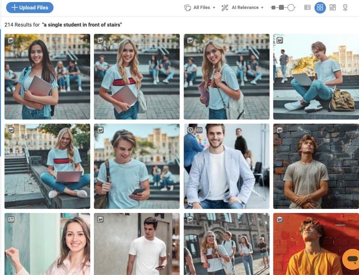 Scenario 2: Now, suppose you need an image of “a single university student in front of stairs”. This is a more specific request that would typically be difficult to capture accurately with traditional metadata tagging. However, AI Visual Search can distinguish this nuanced context, allowing it to retrieve images that match this precise requirement.