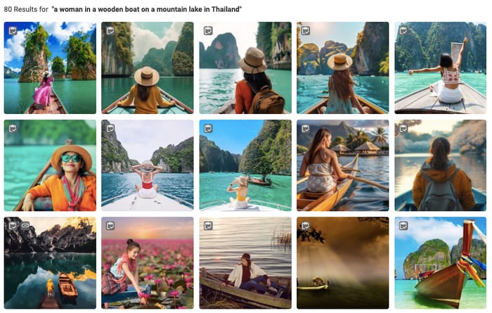 Finally, you require an even more specific image: “a woman in a wooden boat on a mountain lake in Thailand” This level of detail would typically be a nightmare to search for manually, but with AI Visual Search, it’s a breeze. In just seconds, AI Visual Search hones in on images that match this exact description, saving you valuable time and ensuring you find the perfect visual for your campaign.