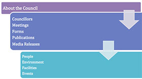 In this example, “About the Council” is a main menu heading, under which you’ll find the sub-headings of Councillors, Meetings, Forms, Publications and Media Releases.