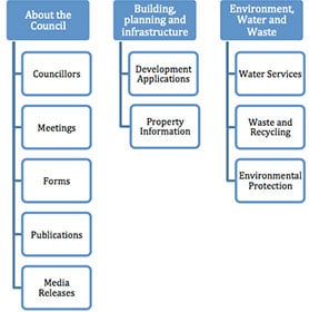 A simple way to approach this is to consider the layout of your website, which should already be structured in terms of menus and sub-menus. For example, most Local Councils use a website menu structure that’s similar to the following.